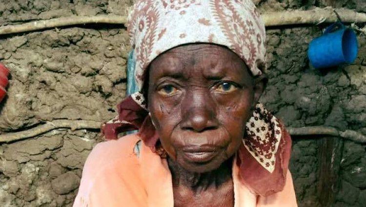 Esta é a senhora Talina, vizinha de Malfa e de sua mãe. Ela vive com a nora e dois netos. A nora trabalha na machamba e elas só se alimentam quando têm serviço. Dona Talinda está desnutrida, pois só come castanhas das árvores e cacane, erva amarga do campo. Ela e sua família foram