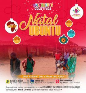 Para que esse sonho que sonhamos juntos possa ser realizado, contamos com você. Sua ajuda, como sempre, é importantíssima para que possamos ajudar a brotar nos nossos pequenos, a leveza de ser criança. Para colaborar é só realizar uma doação avulsa do valor que puder, em qualquer uma das contas da FSF e encaminhar o comprovante para o e-mail doacoes@fraternidadesemfronteiras.org.br com o título “Natal Ubuntu”.