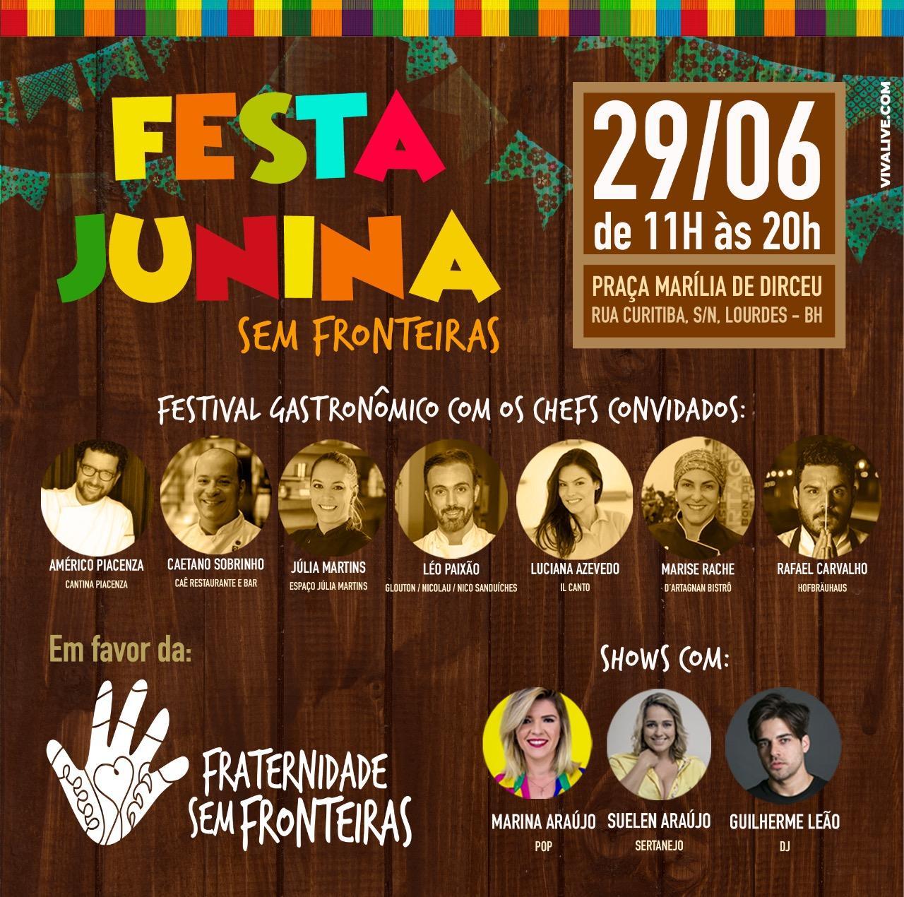 Junho é um mês de festas juninas e, os voluntários da Organização Humanitária Internacional Fraternidade sem Fronteiras (FSF) de Belo Horizonte/MG, entraram no festejo desta época do ano e criaram a 1ª Festa Junina da FSF em BH – com alta gastronomia e grandes artistas regionais. O evento acontece no próximo sábado (29), das 11 às 20 horas, na Praça Marília de Dirceu.