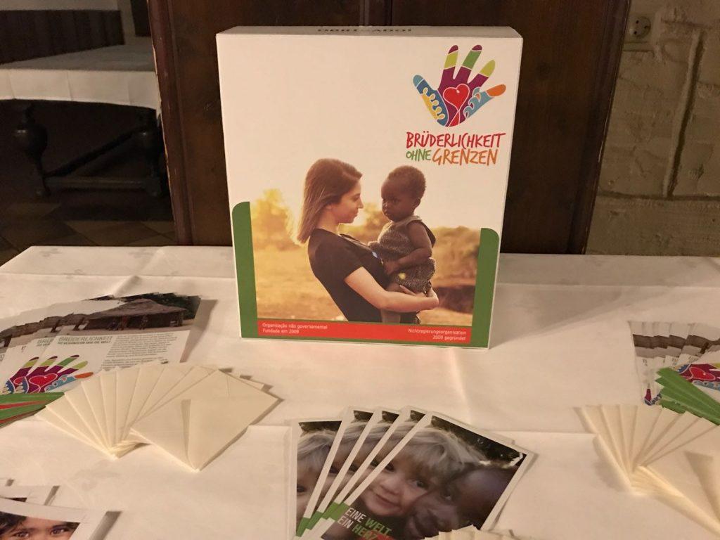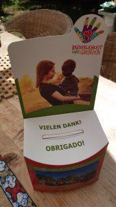 “Em abril de 2017, recebemos a visita do Andrei Moreira, o qual veio pela primeira vez falar da Fraternidade sem Fronteiras na Alemanha. Durante os preparativos do evento me surgiu a ideia de fazer uma caixinha para doações e disponibilizá-la no local. A princípio, pensei numa caixa GRANDE com o intuito de colar alguma fotos e frases. Como não tinha em casa uma caixa adequada, liguei para um amigo alemão que tem uma firma de cartonagem, impressão e gráfica designer. Este meu amigo, Tilman Höhing, conseguiu sobreviver depois que sua cidade foi bombardeada durante a Segunda Guerra Mundial, em dezembro de 1944, ficando TOTALMENTE destruída. Me lembro que liguei para ele perguntando se teria uma caixa, de preferência GRANDE, e se possível com uma abertura no formato de cofre. Salientei que a abertura deveria ser GRANDE também. Ele me perguntou curioso “Por que uma abertura grande?“ Foi então que comecei a explicar o propósito da caixa. Falei da Fraternidade sem Fronteiras, do Wagner e seus desafios e disse que precisava de uma caixa para fins de arrecadação e que nela gostaria de colar algumas fotos da FSF. Expliquei que a abertura GRANDE seria para passar com maior facilidade as notas de 500 euros, pois estas se diferem das notas de menor valor por serem maiores e mais largas.