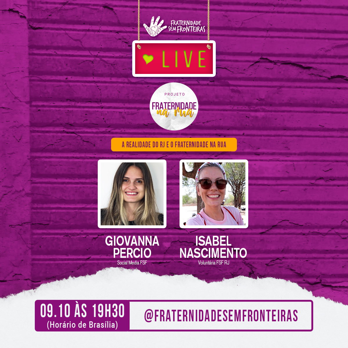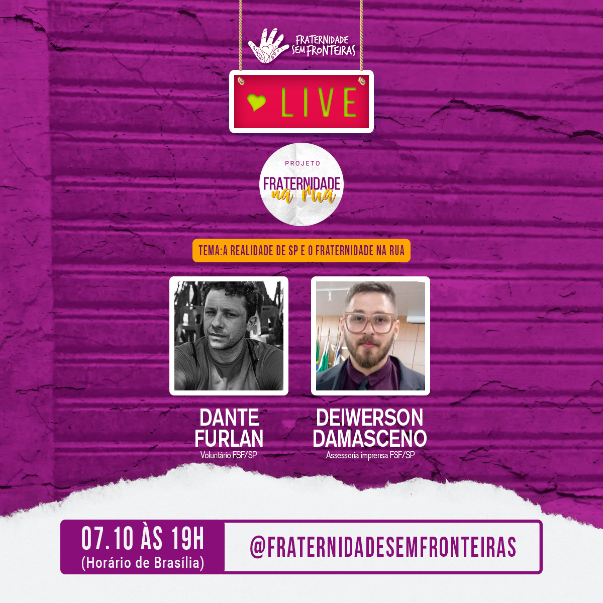 Na quarta-feira (07/10), às 17h (horário de Brasília), participam da série “Fraternidade na Rua”, Dante Furlan (voluntário FSF/SP) e Deiwerson Damasceno (assessor de imprensa FSF/SP), que irão abordar sobre a realidade das pessoas em situação de rua em São Paulo e a importância de projetos de acolhimento a esse público. Giovanna Percio (social media FSF) e Isabel Nascimento (voluntária FSF/RJ) darão continuidade a discussão do tema na sexta-feira (09/10), às 19h30 (horário de Brasília).