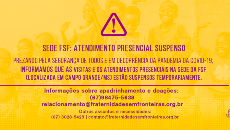 Prezando pela segurança de todos e em decorrência da pandemia da Covid-19, a Fraternidade sem Fronteiras suspende temporariamente, a partir de 23 de dezembro de 2020, as visitas e os atendimentos presenciais na sede da FSF (localizada em Campo Grande/MS). O atendimento continua sendo realizado nos canais: (67) 3028-5429 e contato@fraternidadesemfronteiras.org.br e informações