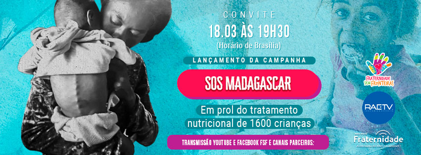 A Organização humanitária Fraternidade sem Fronteiras (FSF) lança no próximo dia 18 de março, quinta-feira, a campanha SOS Madagascar. O evento será transmitido, ao vivo, a partir das 19h30 (horário de Brasília) pelas redes sociais da ONG e também de parceiros, como Rádio Web Fraternidade, Rede Amigo Espírita e Andrei Moreira (diretor de Relações Públicas FSF).