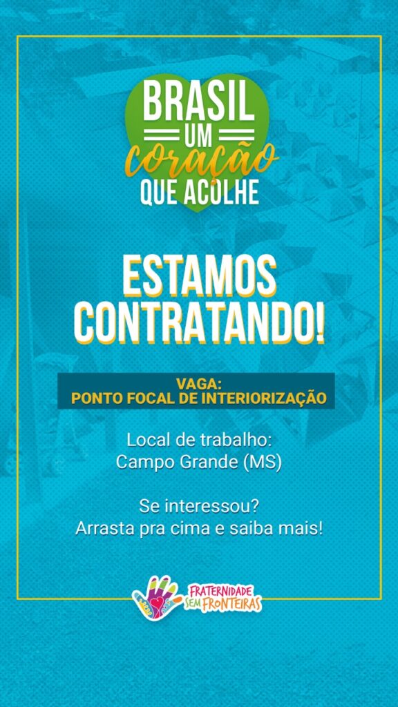 O projeto Brasil, um coração que acolhe da Organização humanitária Fraternidade sem Fronteiras (FSF) está com vaga de emprego aberta para a função de Ponto Focal de Interiorização com atuação em Campo Grande. A data de início dos trabalhos é no dia 03 de maio e têm como intuito reduzir o impacto da chegada de refugiados e migrantes venezuelanos, que estão recomeçando as vidas no Brasil.