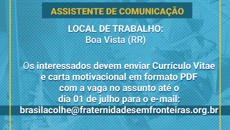A oportunidade é para o profissional auxiliar e dar suporte na divulgação das ações do projeto Brasil, um coração que acolhe Por- Viviane Freitas, assessora de imprensa FSF Está aberta uma vaga de emprego para a função de Assistente de Comunicação, com atuação em Boa Vista – Roraima, no projeto Brasil, um coração que acolhe,