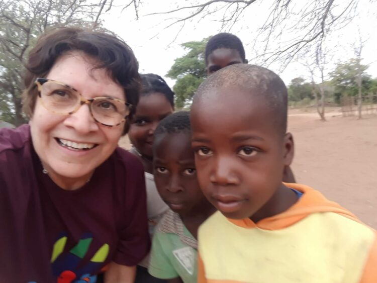 Elaine Perez junto aos acolhidos do projeto Acolher Moçambique