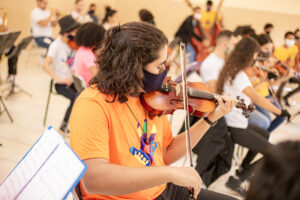 Sobre a Orquestra Filarmônica Jovem Emmanuel – Atualmente são 92 alunos em aulas de música com instrumentos de cordas (violino, viola de arco, violoncelo e contrabaixo) e sopro (flauta, clarinete, trompete e saxofone). Todos os materiais e instrumentos são oferecidos de graça pelo projeto. Antes da pandemia, a Orquestra contava com 120 estudantes e tem capacidade para até 300 alunos. Em 2021, as aulas presenciais retornaram respeitando todas as medidas de biossegurança.
