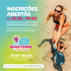 Voluntários da Organização humanitária Fraternidade sem Fronteiras (FSF), promovem o 1º Open Beach Tennis sem Fronteiras, de 31 de março a 3 de abril, na Arena Posto Fórum TMI e Arena Sicredi, em Rondonópolis, MT. As inscrições foram abertas dia 10 de fevereiro e vão até dia 14 de março.