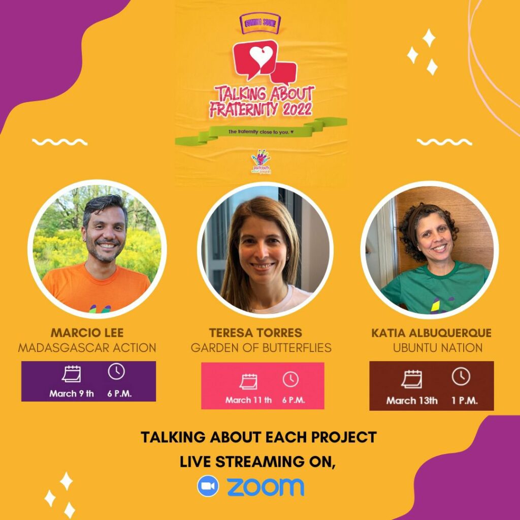 No Canadá, o tema do encontro será sobre o projeto Jardim das Borboletas, nesta sexta-feira, dia 11/03, às 20h (horário de Brasília), com a participação da palestrante Teresa Torres. A transmissão será on-line pela plataforma do zoom e em inglês. Ainda no Canadá, dia 13/03, domingo, às 15h (horário de Brasília),a convidada Katia Albuquerque vai falar sobre o projeto Nação Ubuntu, também pelo zoom.