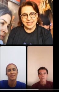 No alto, Gyselle Tannos, a esquerda Angelita de Paula e a direita, Silmar Moura Gomes, durante uma live para a divulgação da Campanha pelo Centro Educacional em Madagascar.