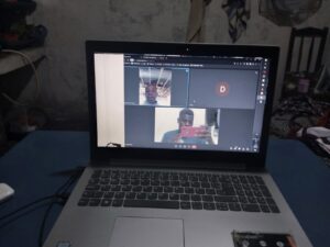 Enoqque assistindo as aulas de inglês por meio do notebook da iniciativa Teaching without Borders