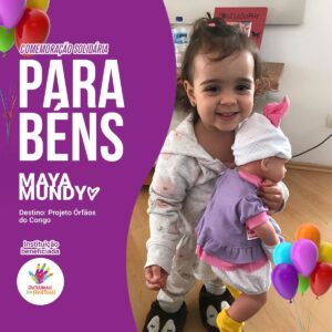 O Projeto Órfãos do Congo, da Organização humanitária Fraternidade sem Fronteiras (FSF), será beneficiado com a comemoração solidária organizada pela família da pequena Maya Mundy, do Rio de Janeiro – RJ. A menina completa dois anos neste sábado, dia 17 de dezembro, e os convidados foram avisados de que os presentes serão direcionados para os acolhidos da FSF na República Democrática do Congo.