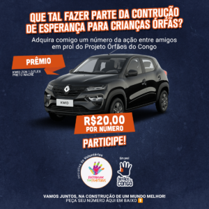 A Fraternidade sem Fronteiras recebeu como doação um carro Kwid 0km, da marca Renault. Visto a necessidade de acolher mais crianças e manter as que já vivem nos orfanatos do projeto Órfãos do Congo, e a manutenção do espaço, uma das nossas voluntárias teve a ideia de sortear o veículo.