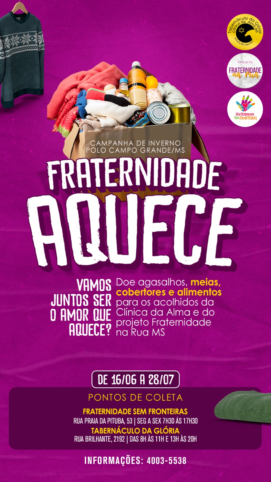 O projeto Fraternidade na Rua, polo de Campo Grande – MS, da Organização humanitária Fraternidade sem Fronteiras (FSF), em parceria com a Clínica da Alma, está com uma campanha para a arrecadação de agasalhos, meias, cobertores e alimentos não perecíveis. Os itens que podem ser doados são: peças femininas, masculinas, infantis, calçados, meias, cobertores e alimentos, principalmente, arroz, feijão, fubá e macarrão.
