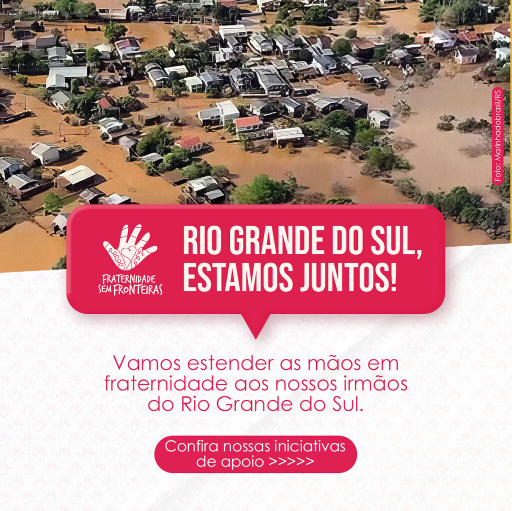 A Organização humanitária Fraternidade sem Fronteiras (FSF) realiza, a partir desta segunda-feira, 6 de maio, a campanha Rio Grando do Sul, estamos juntos! para arrecadar doações para as vítimas dos temporais que atingem o estado do Rio Grande do Sul desde o fim do mês passado. As doações podem ser de alimentos não perecíveis, materiais de limpeza e higiene, cobertores, colchões, roupas, água e em valores com PIX.