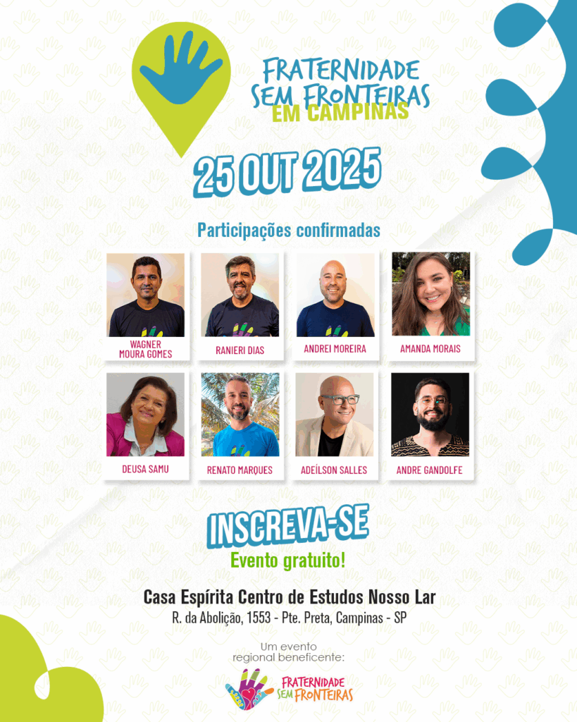 No próximo dia 25 de outubro de 2025, sábado, a Casa Espírita Centro de Estudos Nosso Lar, em Campinas – SP, receberá o Encontro Fraternidade Sem Fronteiras (FSF), um evento beneficente para o amparo de crianças órfãs da República Democrática do Congo acolhidas pela FSF pelo projeto Órfãos do Congo.